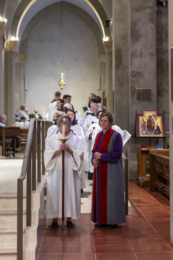 Overseeing everything are our vergers, in purple Cathedral cassocks and white anthems, carrying their ceremonial staff of office, the virge. The vergers have risen through the ranks from acolyte and thurifer, and you may see them perform these other roles as well. They help arrange the details of the service and its choreography in advance, and make sure all runs smoothly.